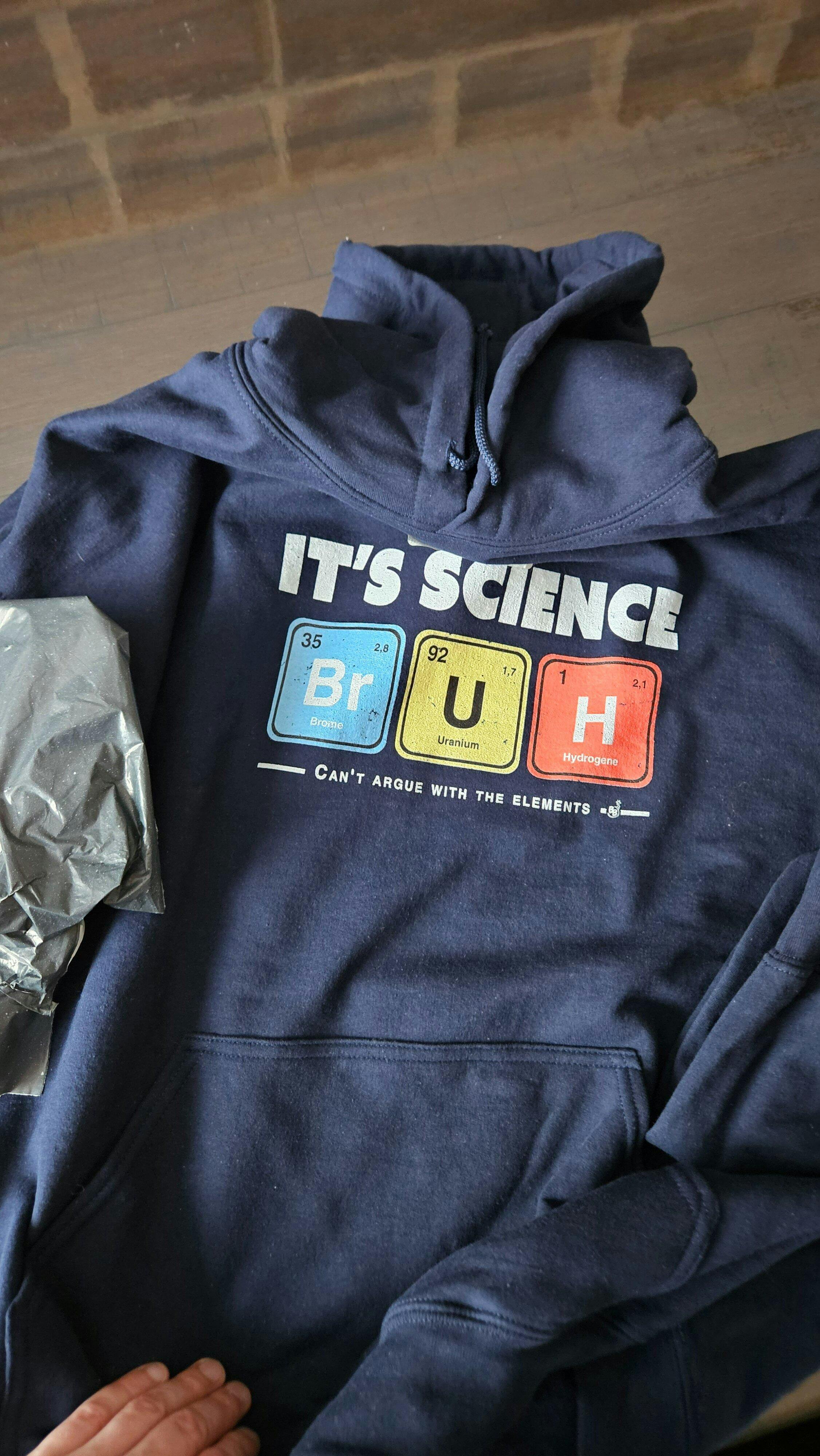 I received my order after a week, which is fine. The print is great... I bought this hoodie for my nephew who is a science fan. I think he should like this hoodie. The quality of the fabric and print are excellent, and the size is, in my opinion, perhaps a little large (XL), but since young people like very large sizes, it should be fine. I will definitely come back to buy something for myself eventually.